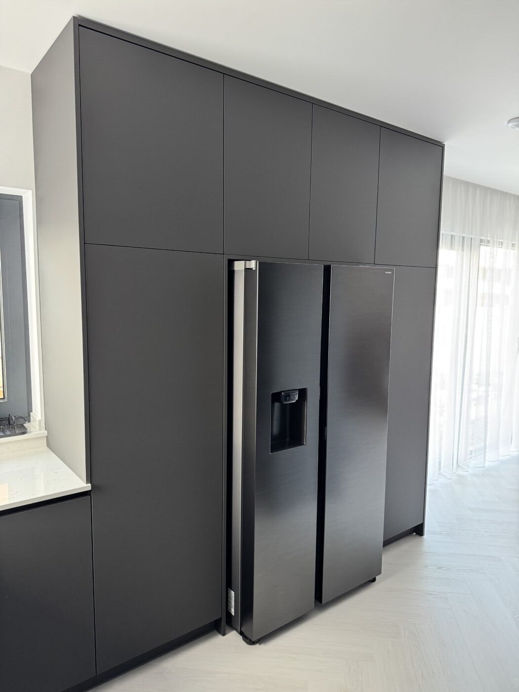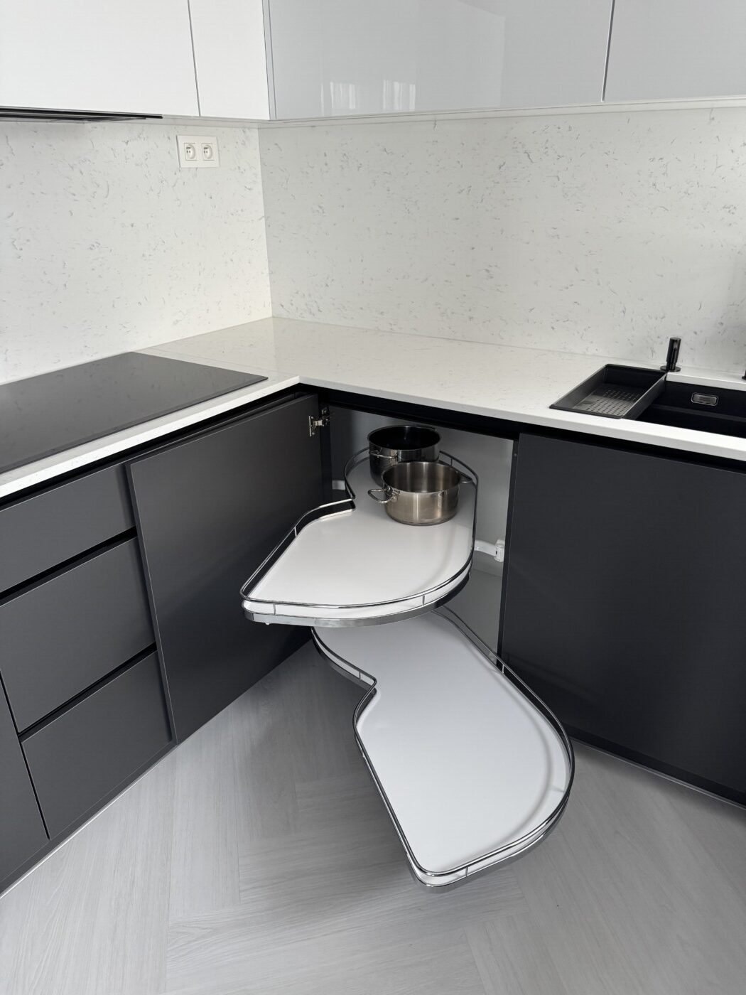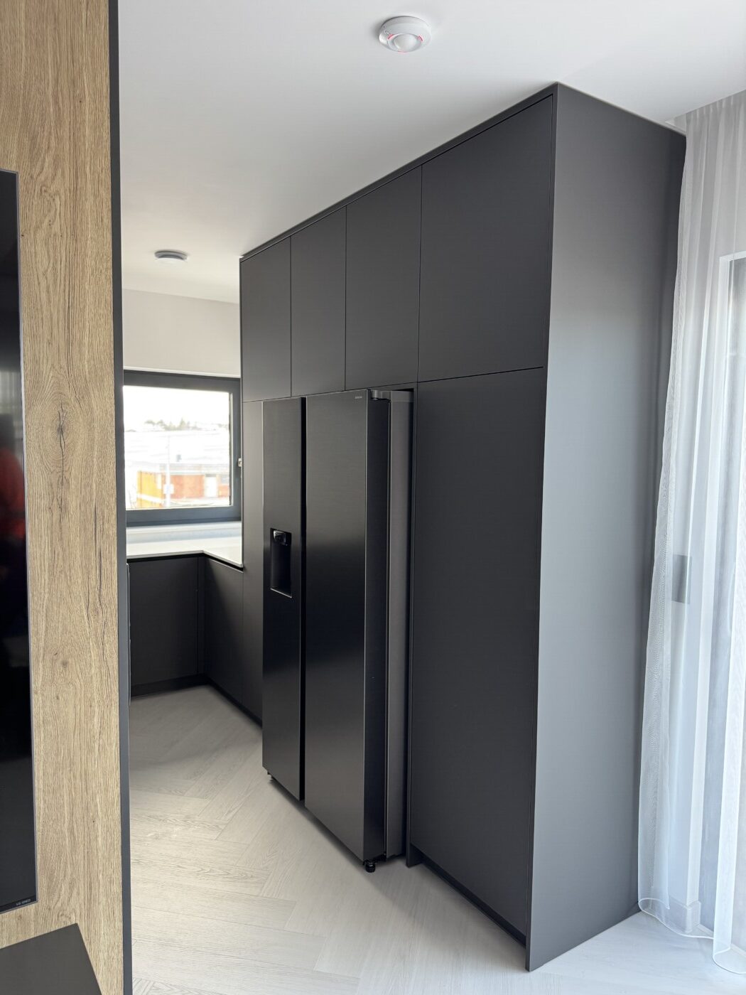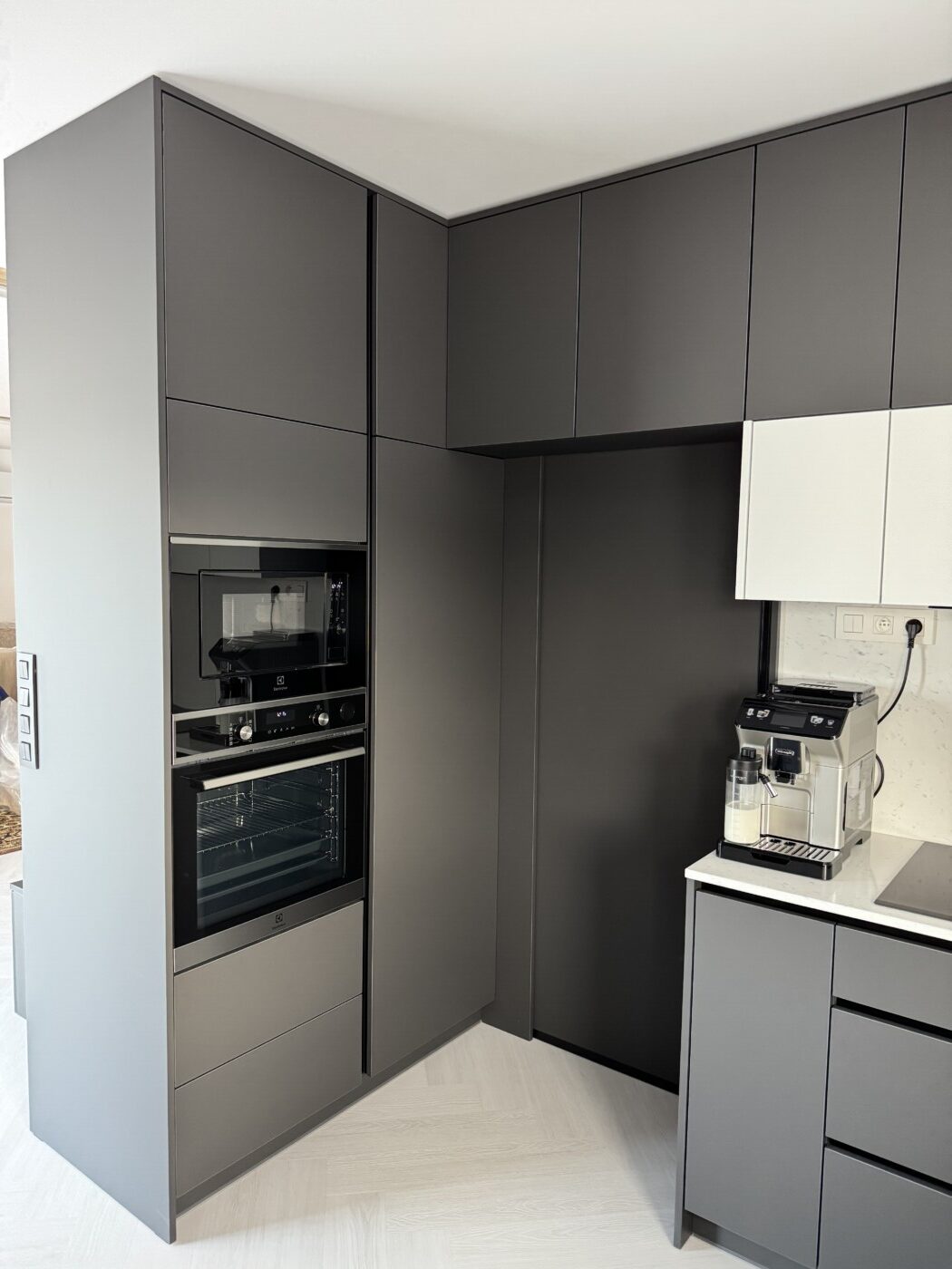 Kuchynská linka a iné – Sp. Belá – Strážky Materiál, vysoké skrine: EGGER U960 ST9 Onyxovo šedáMateriál, spodné skrinky: EGGER U763 ST9 Perlovo šedá - striekané, v prevedení leskPracovná doska: EGGER F800 ST9 Mramor krištálovýKovania: BLUM Šatník – Veľká LomnicaPREVIOUS Kuchynská linka – ViedeňNEXT