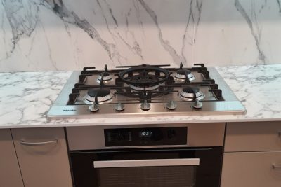 Kuchynská linka v príjemných zemitých odtieňoch doplnené o kompaktnú pracovnú dosku v mramorovom prevedení. Spotrebiče značky MIELE a príslušenstvo značky BLANCO.