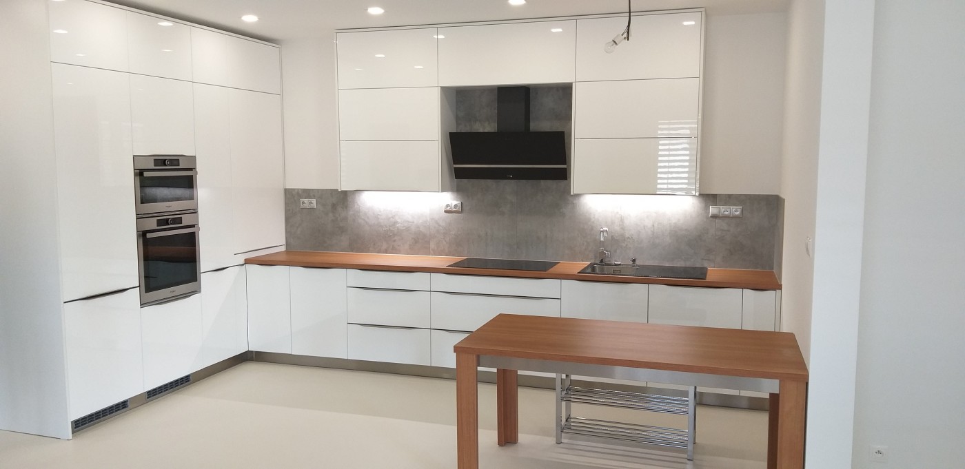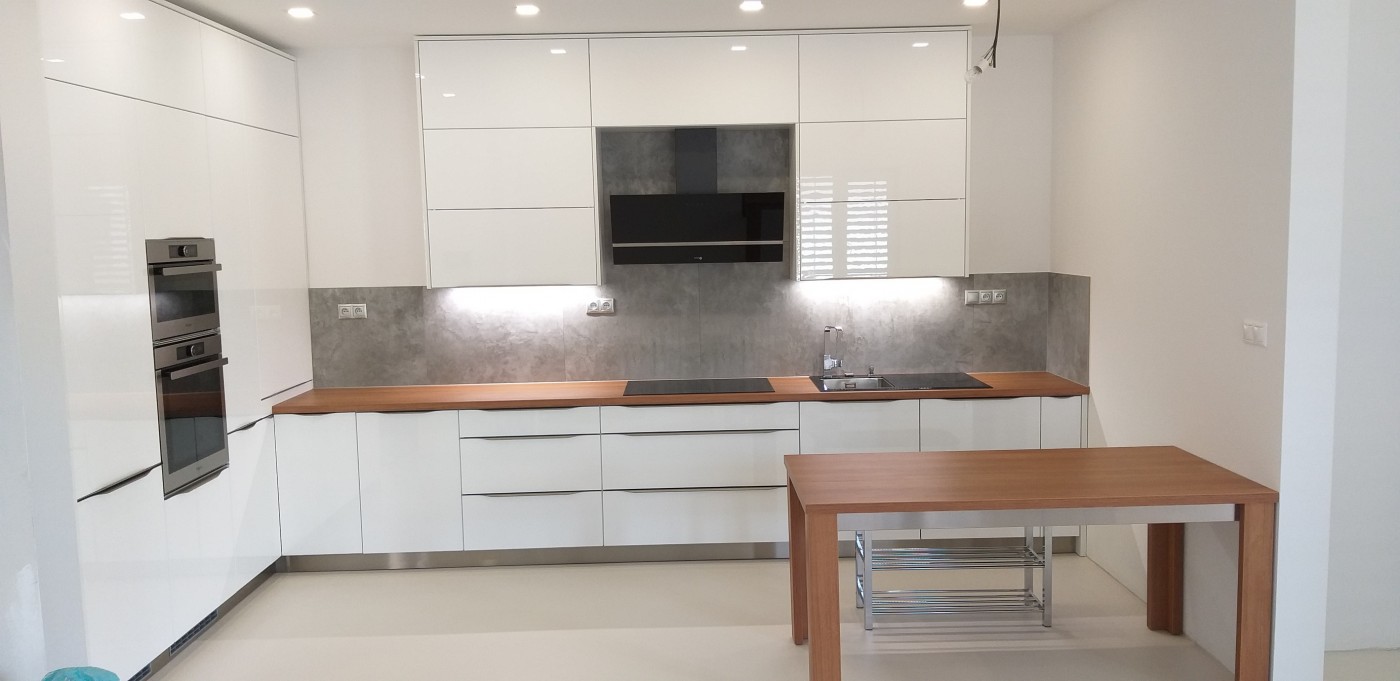 Kuchynská linka – Batizovce Kuchynský nábytok do rodinného domu v Batizovciach doplnený o narážacie úchytky a sklenený drez.Dvierka: Biely vo vysokom leskuPracovná doska: Teak R50084 Golden TeakSpotrebiče: WHIRLPOOL Kuchynská linka – Veľká LomnicaPREVIOUS Kuchynská linka – ŽilinaNEXT